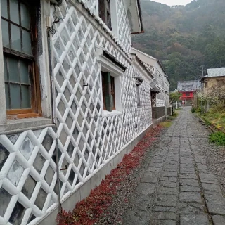 きんぎょの休日25 松崎▷ なまこ壁(瓦を漆喰で貼り付けた壁、昔はよくあったらしい)がたくさん残る松崎