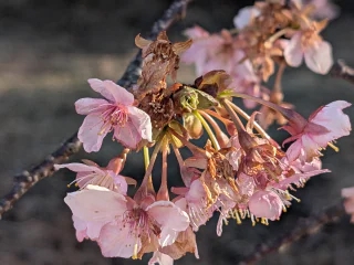幹にぴったりくっついてつぼみができて、咲く梅の花は、丸くてかわいい花びら