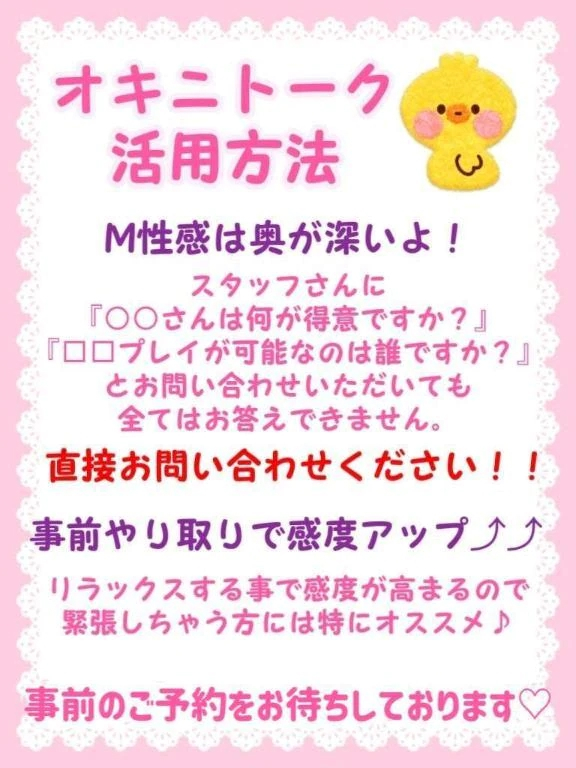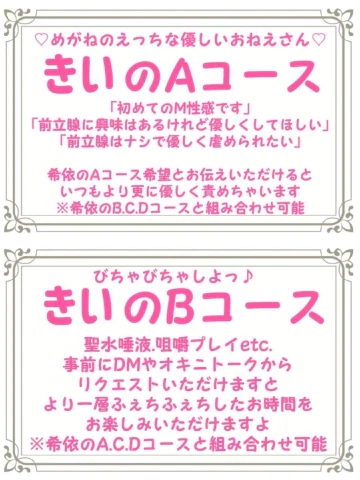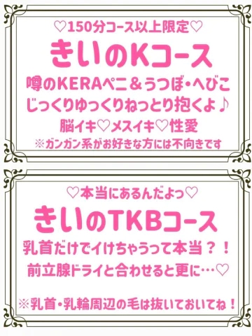 ◇1通目から長文大歓迎◇・メッセージはきいがマイページにログ インしたタイミングで確認出来ます・リアルタイム通知ではないのでお時間を気にせずお送りください・ラインの様に連続送信出来ません。ご注意ください・1日のやり取りの上限がございます。ご注意ください・「こんにちは」「相互フォローありがとう」などはスルーする可能性がございます。1通目からガッツリ送ってください!!いつものクセで一言で送ってしまったと言う場合は翌日に再度送ってください。◇ご自身のM性感歴、前立腺歴など自己紹介◇・ドライオーガズムがしたくてM性感に通いはじめて◯年目です・アナル経験は◯回目です・自分で開発してます・いつも◯◯なプレイをしています・Xできいさんを見つけました、◯◯さんからの紹介です等の自己紹介めちゃくちゃ嬉しい!◇ご希望のプレイ◇優先順位の高い順にお伝えくださる方、最高❌️可能なプレイ、得意なプレイは何ですか?ではなく⭕️こんなプレイをしたいが対応可能か?でお願いします。NGプレイは出血を伴うプレイ、フードクラッシュ以外のクラッシュプレイ尿道などの医療系プレイは必要なモノをご持参&衛生面補助をしてくださる方のみご対応可能◇コース選択◇・個人コースは1つに決める必要はありません・お店のコースは4つの中から1番ご希望に近いコースをお選びください「◯月◯日◯時から予約した◯◯です。M性感がはじめてでおしりに興味があります。お店のコースはアナル前立腺コースにしましたが、おしりの経験はないのできいさんのAコースとCコースのイメージでお願いします」「唾液が好きなのできいさんのBコースとDコースといった感じになるかと思います。◯◯なプレイが好きです。」◇したい事、気になるアイテム◇事前に詳しくお伝えいただけるとそれに合わせたご準備で伺えます。基本アイテムは持ち歩いておりますが、個人アイテムは持ち歩いておりません。「今回は初めましてなのでアナル前立腺コースの120分コースでお願いしました。いつかはKERAペニをしてみたいと思っています。実物をみる事は可能ですか?」→喜んでお持ちいたします♡「完全拘束で絞り取られたいです」→お部屋でリクエストを伺った場合は基本アイテムの手枷しかご用意がございませんが、事前にお伝えいただければボンデージテープやマミーラップをお持ちする事が出来ますM性感は奥深い世界です。オキニトークの事前やり取りで貴重なお時間がより良いお時間になります様に