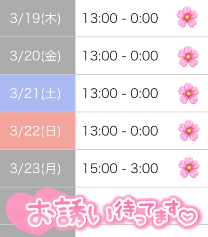 3月入ってからシフト出しましたが、出勤までまだ2週間以上あるのにも関わらず、早速もう既に予約してくれた仲良し様方ありがとうございます💐🤍
