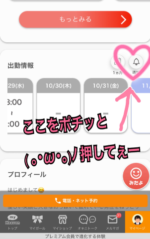 もしご負担でなければ、お店の___ページから【出勤通知ON】の設定をしていただけると、ゲリラ出勤の際もいち早くお知らせできます??
