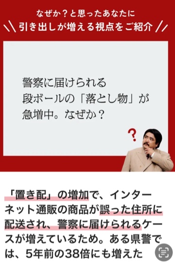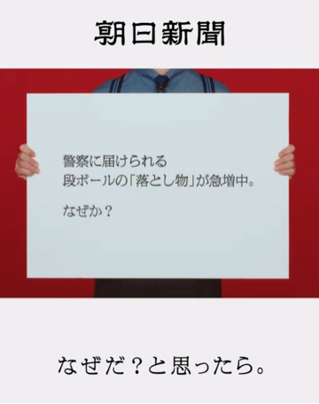 すごく納得しちゃいました🤔✨✨警察の方々も、段ボール📦が大量に届いてしまって大変ですね😮💦それはそうと・・・こんな続きが気になっちゃうワクワクする広告を出しちゃう朝日新聞さん、すごく素敵っ✨✨朝日新聞さんのこの種類の広告、あといくつかあるみたいなので、YouTubeで見てみようと思います😊✨✨答えを考えながら・・・ワクワク♡しちゃう予定です🤭✨✨そして今日は、お兄様とも・・・一緒にワクワク♡、そしてドキドキ♡のお時間を過ごせたら、とっても嬉しいです🥰❤️元気いっぱい出勤しました😊✨✨日々お疲れのお兄様の癒しとなれる様、いっぱいつとめさせてくださいね✨✨今日は寒い一日になりそうですが、皆様、風邪などひかぬ様、暖かくしてお過ごしくださいね💕💕 -