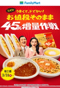45%盛り🥰おはようございます✨✨昨日の雨、なかなか激しかったですね☔️☔️仕事終わり、会社の玄関を出た瞬間、あまりの雨の強さに・・・一瞬、帰るのを躊躇いました😅笑今日も徐々にまた雨のお天気に戻ってしまうみたいです☔☔️皆様、移動など どうぞお気をつけてお過ごし下さいね😊✨✨今、ファミリーマートで『お値段そのまま 45%増量作戦』というイベントが開催されていますね😊👍