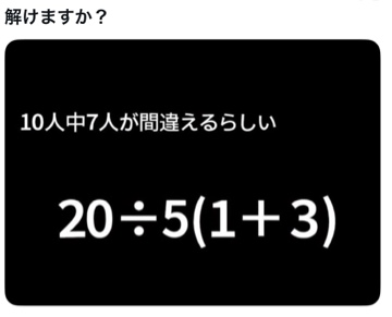 これ、SNSで流れてきて10人中7人が間違えてしまうらしいです🙅♀️✨私も挑戦してみましたが・・・(私の出した答えは『1』です✏️✨)まんまとやられちゃいましたぁ〜🙀💦どこから計算を始めれば良いのか❓❓どういう順番だったっけ❓❓確か・・・(カッコ)から計算するんじゃなかったかな❓❓もう昔の知識過ぎて、すっかり忘れてしまっていました🤭✨✨笑ちなみに正解⭕️は『16』なんだそうです🙆♀️✨✨見事正解された方、おめでとうございまーす👏👏👏✨✨たまにはこういう頭の体操をしてみるのもいいな♪って思いました🤭✨✨元気いっぱい出勤しました✨✨数学は、解いていく公式や順番がありますがお兄様とのお楽しみのお時間♡は・・・ムード作りから少しずつ始まっていく感じも・・・💕💕開始から即・もみくちゃに(笑)ディープな感じも・・・💕💕どちらもすごくドキドキ♡して好きです🥰❤️(えへへ♡笑)もし良かったら仲良くして下さいね🥰❤️皆様の今日が穏やかで素敵な一日となります様に💕💕 -