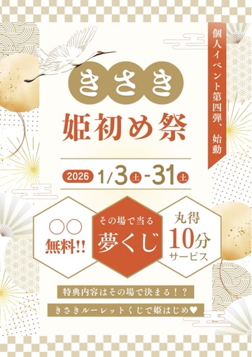 いよいよ本日より、2026年初めての個人イベントがはじまります〜👏今回も企画考案から告知デザインまでproduce by.きさきです😘ちょっとだけ内容が変わりました…✨️新年なのでほぼ全部盛りになりました♡こんなに全部盛りするのは最初で最後かも…💦太っ腹エロティック祭りだと思って、きさきと一緒に楽しんで頂けたら一番嬉しいです🙌ちなみにルーレットくじですが、演出発生確率なんと100%です😳きさきのエンタメとしてどうぞお楽しみ下さいませ🎰(笑)2026年の姫はじめはこの日記をみているそこの貴方様…♡ねっとりじっくり味わってね😏今日出逢う殿方様と2026年最初の姫はじめで幸せと癒しとエロスで満たされますように♡今日も最後まできさきの日記を読んで頂き、ありがとうございます🎀♡🐰希咲(きさき)🐰 -