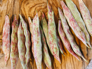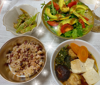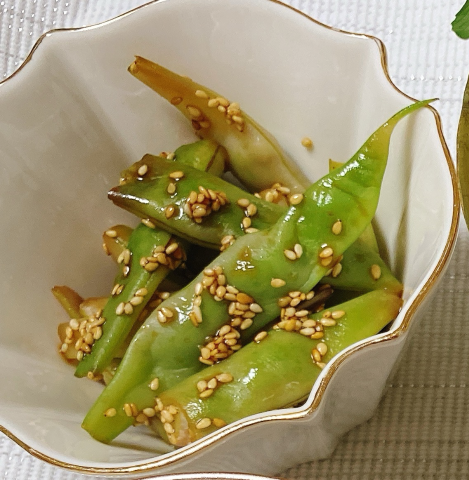 昨晩の、お鍋のサイドメニューに、綺麗な赤い縞が入った、桑の木豆で胡麻和えを作りました