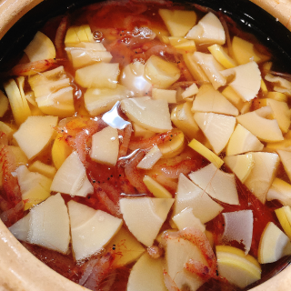 おはようございます昨日、仲良し様に、筍を頂いたので、今日は筍を入れて筍と、桜エビの炊き込み土鍋ご飯を炊きました