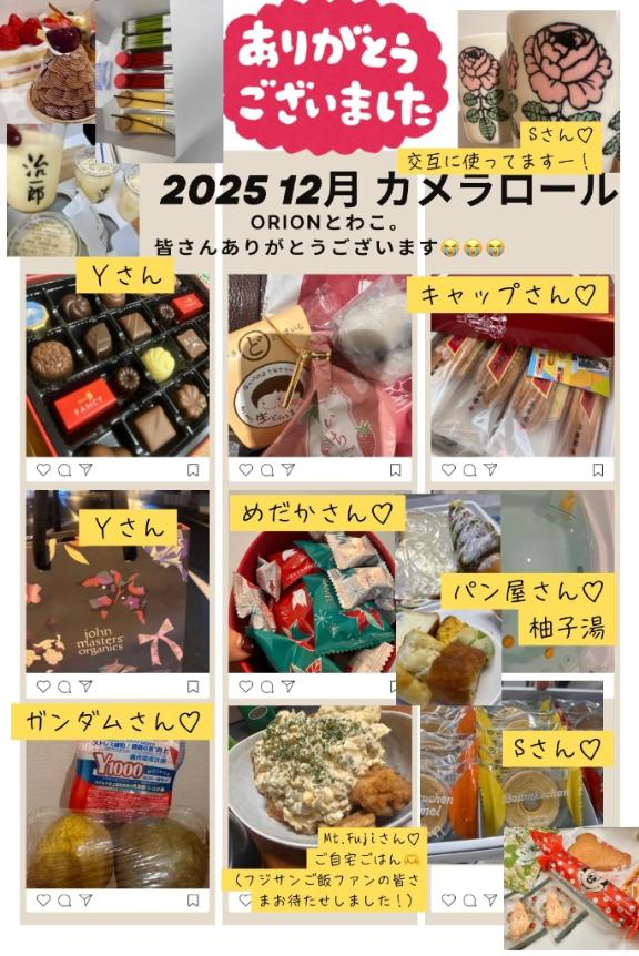 2025年12月のカメラロールが、皆さんから頂いたお菓子やご飯の写真で溢れていてとてもしあわせで、にやけます。
