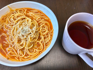 朝ごはん兼お昼ご飯トマトスープパスタ
